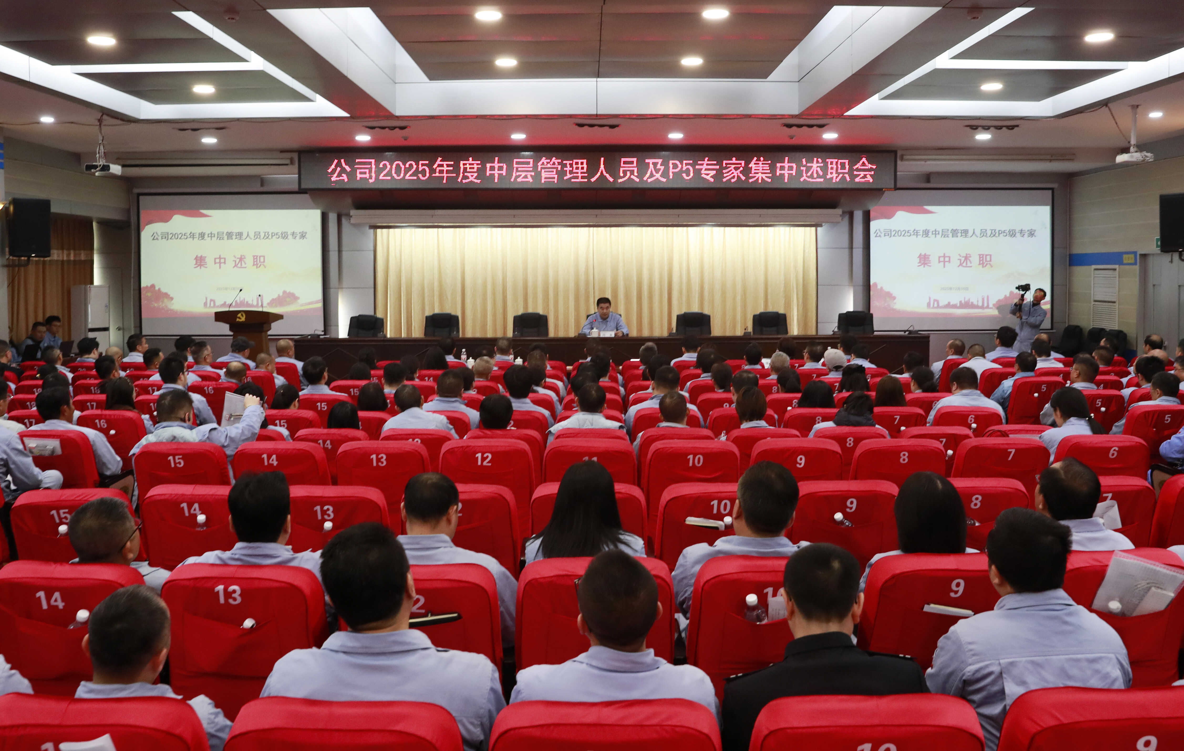 2025年设定的目标任务都完成了吗?2026年该如何更好地履职尽责呢?12月10日,为深入学习贯彻习近平总书记关于干部队伍建设的重要论述,加强对干部全方位管理和日常性监督,切实将考核“指挥棒”变成发展“助推器”,公司2025年度中层管理人员及P5级专家集中述职火热进行。公司领导闫友、曹晓扬、李伟亮、马井泉、赵晓林、彭俊兴、王运永出席会议。81位述职人依次登台,亮成绩、晒不足、明方向,形成比学赶超、争先进位的生动局面。109位职工代表们以饱满的精神状态,认真倾听述职,神圣履行监督和评价权利。
